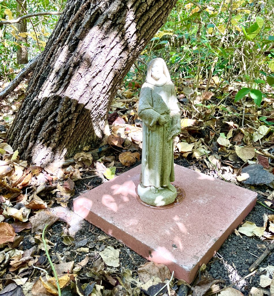 Thanks to Steve Pickett working on the Woods Trail eastward extension, it was found again, but broken in two. Scooter Smith cleaned it up and patched it back together again. The statue is not large, so we bought it a paving-stone base that weighs a great deal so it can’t be easily stolen.