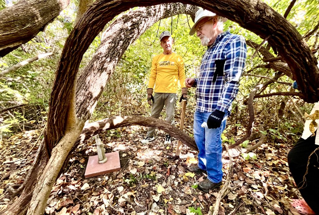 A couple decades ago, Michael Parkey stumbled upon a St. Francis of Assisi statue in the woods. It got dubbed the Druid of Eastwood (later named the Dixon Branch Druid). But then we lost track of it when the woods became greatly overgrown with privet.