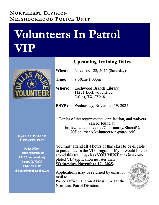 To submit your application, scan and email it to Officer Theron Akin #10640, the VIP Coordinator for northeast Dallas, or print and mail or drop off to the Northeast Dallas Police Department station located at 9915 East Northwest Highway, Dallas TX 75238. Call 214-670-7772 with questions.