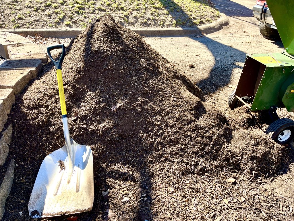 Francis hauled his beast of a grinder to the garden site and began to grind. But first he had to spread out the composted mulch to dry it out. After several days and many hours of work, he whittled the compost pile down by half. We’ve informally deemed the bed the “Francis Shaner Honorary (But Not Dead Yet) Garden.