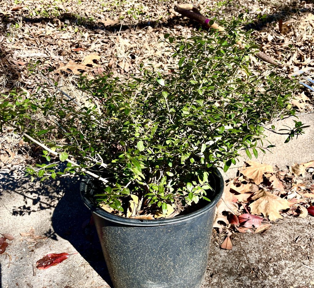 <> Some plants, dug up or purchased, in pots: Shrubs: dwarf yaupon, beautyberry, coralberry. Flowers: Gregg’s mistflower (Conoclinium greggii), dwarf ruella (Ruellia brittoniana, also known as Mexican petunia), flame acanthus (Anisacanthus quadrifidus, also known as desert honeysuckle or hummingbird bush), purple heart (Tradescantia pallida). We already have inland seaoats and mini mondo grass.