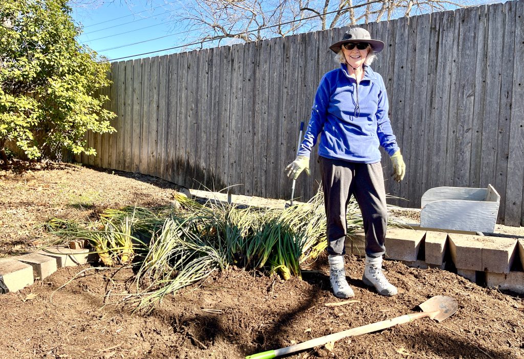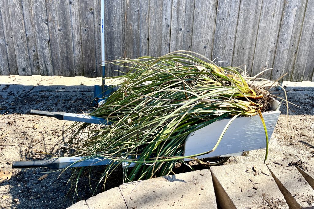 But to do today’s work on the bed, they had to be evicted and put in a wheelbarrow. Once their final spot was completed, we picked out the best looking ones and dug them into the bed.