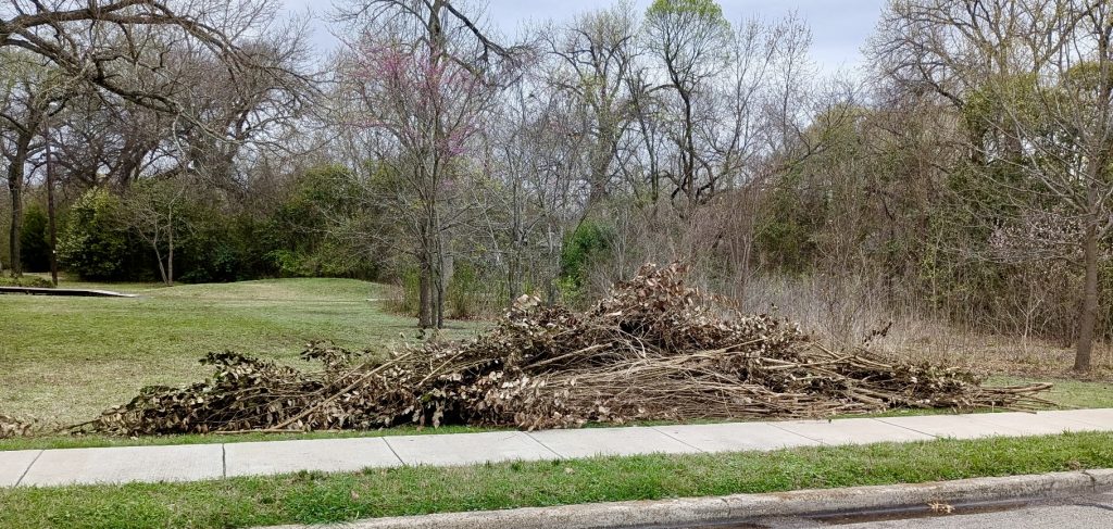 This monster pile below had been behind the playground from when Cade and I took a successful 2-hour privet-slaying foray in what we call the Ligustrum Forest. The guys dragged it to the curb. Yay!