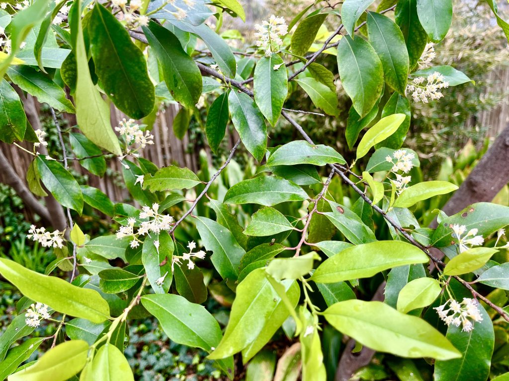 So when I get all excited about finding cherry laurel when we remove privet, the photo below shows why. Next year, now that they have more sunlight and water, mature ones may reward us with flowers like this cherry laurel in my yard, which the birds strip of berries every year.