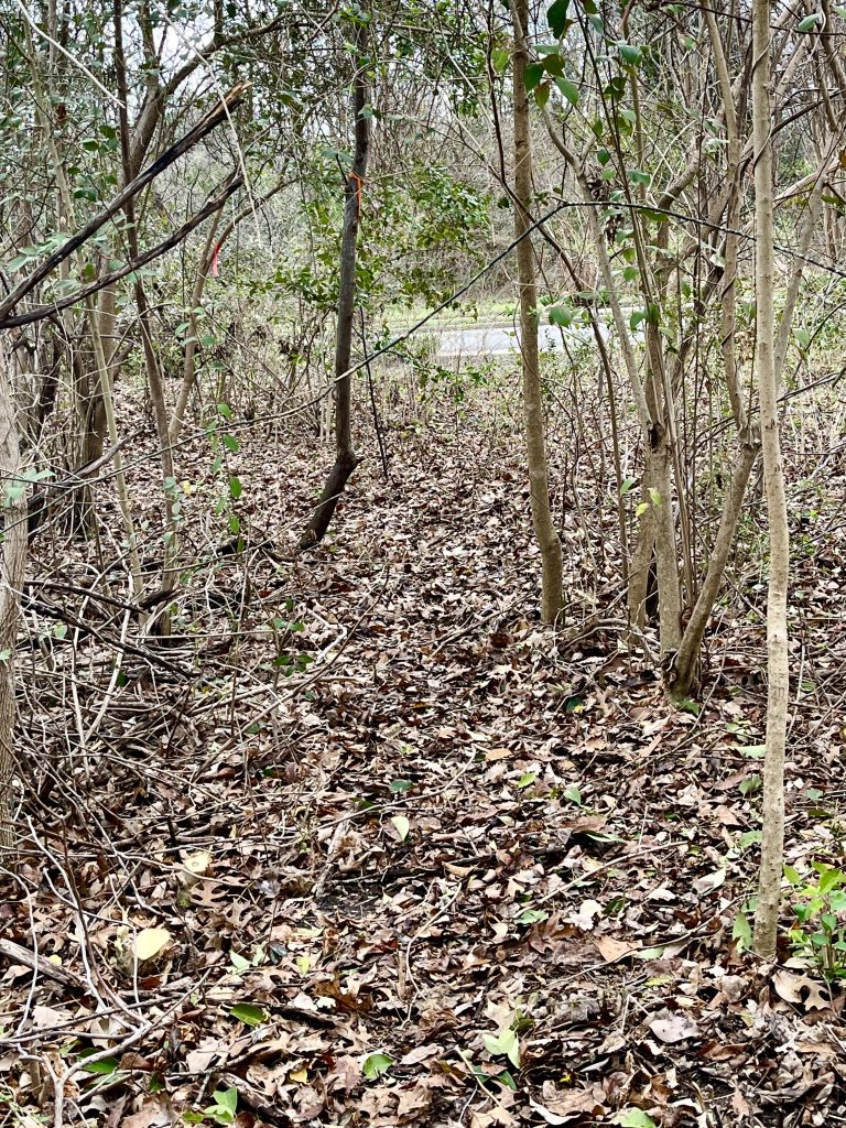 By the way, orange ties indicate the trail. Red ones are invasives slated for removal. Yellow ties mark native plants to be careful around.
