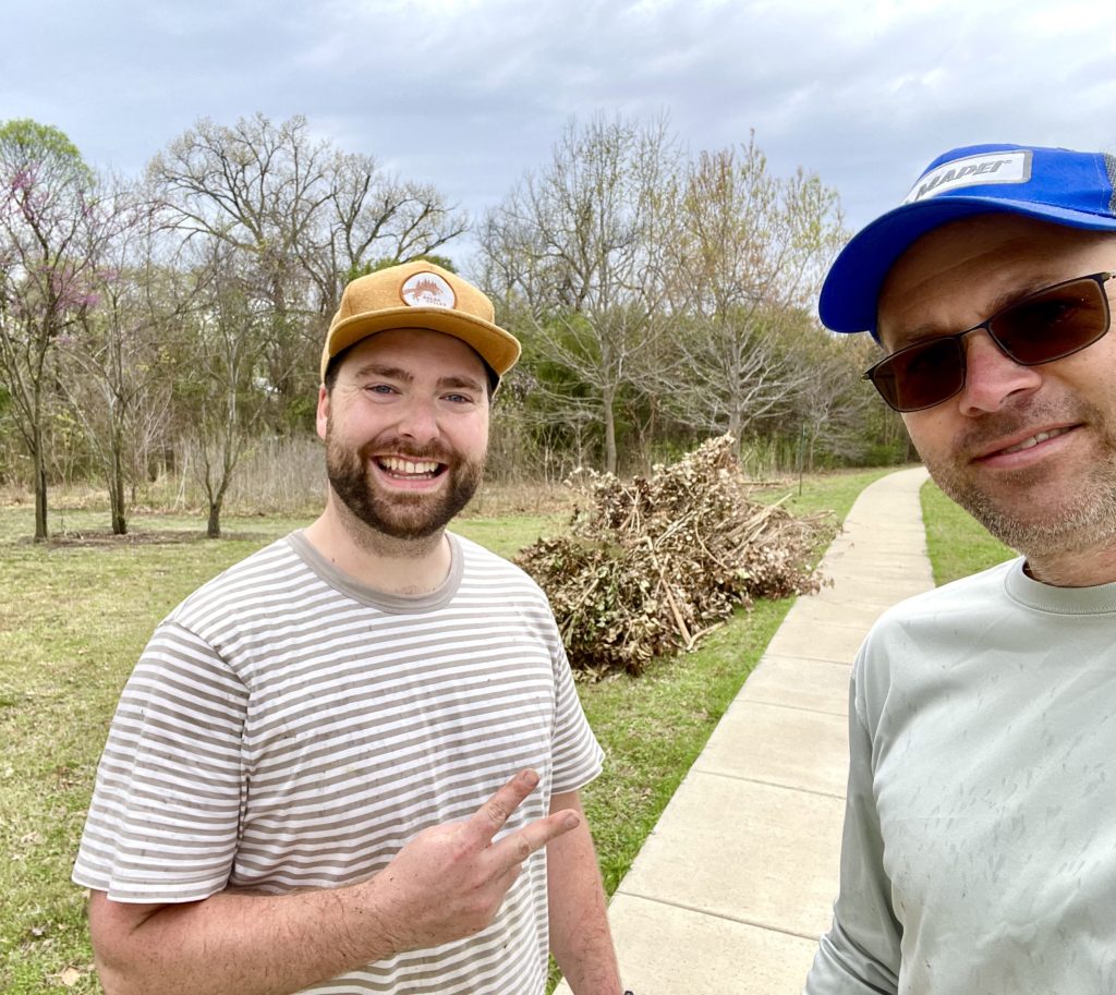 I also seeded inland sea oats/river oats to hold the creekside soil down, and tossed about heartleaf skullcap and spiderwort seeds beneath the trees. We have lots of donated wood fern and Turk’s caps roots that are ready to dig in.