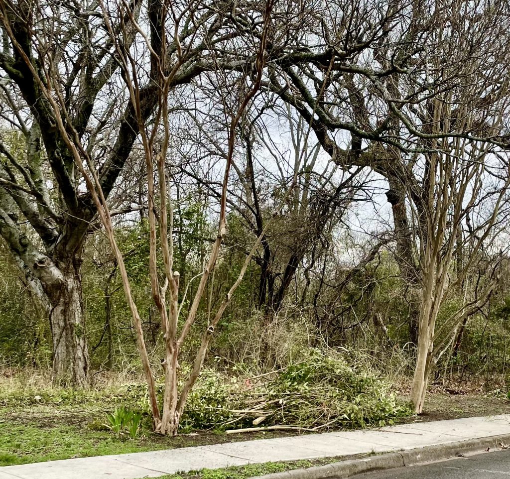 To reach here, a bunch of two-story-tall privet and robust bush honeysuckle had to go. Also a tremendous amount of vining honeysuckle, which was as strong and rangy as briar, but without the thorns, thank goodness. And all along the new trail’s way, I dispatched a fair amount of poison ivy.